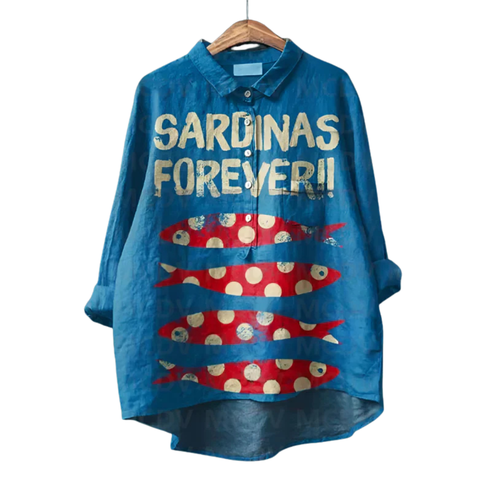 Einzigartiger Vintage-inspirierter Druck: Das herausragende Merkmal? Ein charmantes Fischmuster im Retro-Stil, das gleichermaßen skurril und künstlerisch ist. Es sorgt sofort für Gesprächsstoff und ist eine Anspielung auf das entspannte Küstenflair.